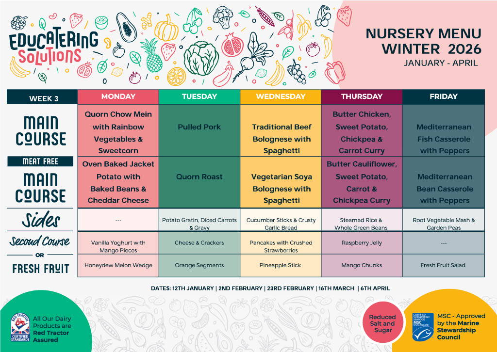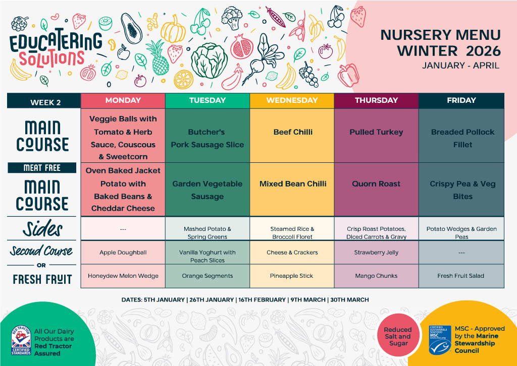 Menus are checked by our Nutritionist to ensure that they contain minimal levels of salt and sugar, as well as ensuring that a variety of food groups are included providing the nutrients that children need for their healthy growth and development.